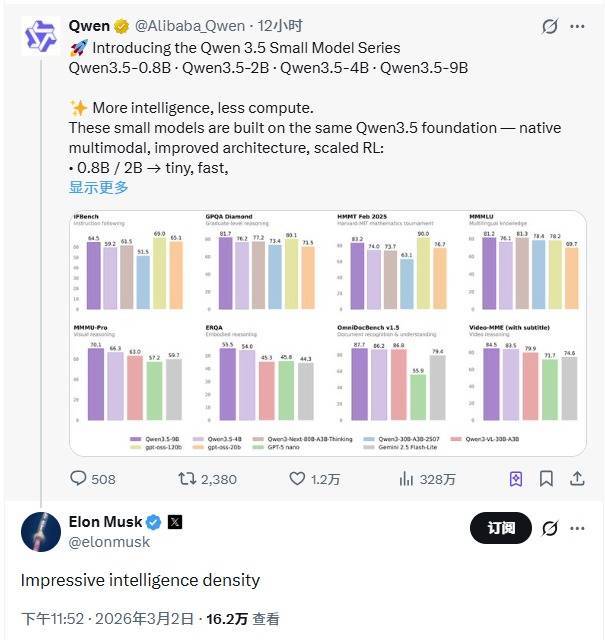 凤凰网科技讯 3月3日,近期,阿里开源三款中等规模的新模型,包括Qwen3.5-35B-A3B、Qwen3.5-122B-A10B、Qwen3.5-27B。基于架构创新和训练突破,此次开源的三款千问3.5模型均创下中等尺寸模型的性能新高,这引发了市场关注,马斯克对阿里巴巴的Qwen模型发表评论,表示“Impressive intelligence density”。